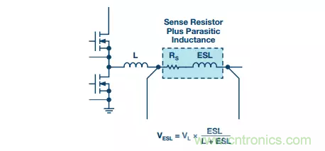 選擇檢測電阻時不應忽略的另一個參數是其寄生電感(也稱為有效串聯電感或ESL)。檢測電阻可以用一個電阻與一個有限電感串聯來正確模擬。