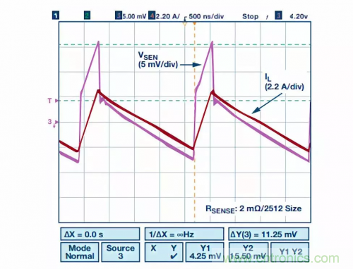 對于降壓調節器,電流檢測電阻有多個位置可以放置。當放置在頂部MOSFET的高端時(如圖3所示),它會在頂部MOSFET 導通時檢測峰值電感電流,從而可用于峰值電流模式控制電源。但是,當頂部MOSFET關斷且底部MOSFET導通時,它不測量電感電流。