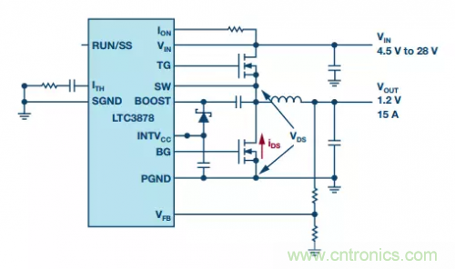 利用MOSFET RDS(ON)進行電流檢測,可以實現簡單且經濟高效的電流檢測。LTC3878是一款采用這種方法的器件。它使用恒定導通時間谷值模式電流檢測架構。頂部開關導通固定的時間,此后底部開關導通,其RDS壓降用于檢測電流谷值或電流下限。