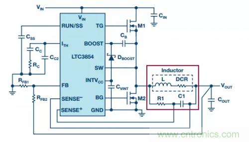 電路不直接測量電感電流,因此無法檢測電感飽和。推薦使用軟飽和的電感,如粉芯電感。與同等鐵芯電感相比,此類電感的磁芯損耗通常較高。與RSENSE方法相比,電感DCR檢測不存在檢測電阻的功率損耗,但可能會增加電感的磁芯損耗。