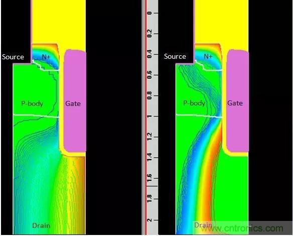 從電勢分布圖,功率MOSFET完全導通時,VDS的壓降低,耗盡層完全消失;功率MOSFET在線性區(qū)工作時,VDS的電壓比較高,耗盡層仍然存在,此時由于在EPI耗盡層產生電子-空穴對,空穴也會產生電流,參入電流的導通。