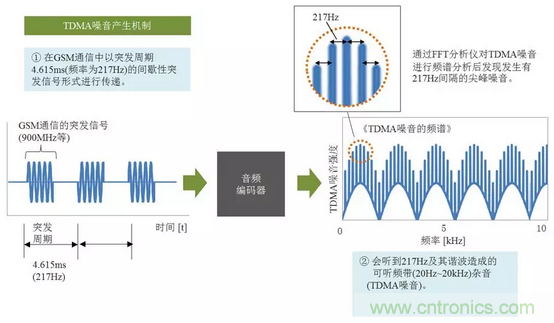 具有代表性的TDMA方式是在歐美及亞洲等世界各地廣泛使用的手機標準GSM。在GSM通信中通過4.615ms周期的間歇性突發信號進行傳遞。該突發周期為217Hz的可聽范圍頻率,因此在不采取對策的情況下會聽到雜音,因此有必要將其去除。