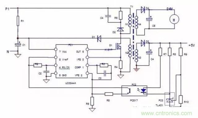 B.對UC3844單獨上電,短接PC2輸入側,若電路起振,說明故障在PC2輸入側外圍電路;電路不起振則檢查輸出側電路。