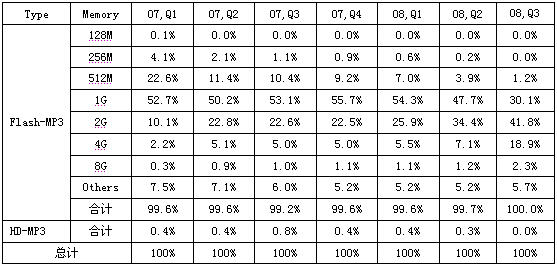 MP3市場各季度銷量同比去年均呈現較大幅度的下滑。2008年第一季度,MP3播放機銷量比去年同期增長-25.3%,第二季度銷量同比增長-50.3%,第三季度銷量比去年同期增長了-53.4%。
