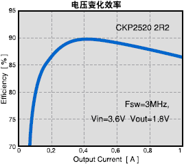 在一定條件下,決定的與降壓型DC-DC轉(zhuǎn)換器開關(guān)頻率相對應(yīng)的電感值。開關(guān)頻率為300kHz 的情況下,需要的是角形4mm,厚度1.8mm 或是角形6mm,厚度為1.2mm的電感。開關(guān)頻率提升為1.5MHz 時,角形3mm 厚度為1mm 電感的使用成為可能,電感的小型化也就得以實現(xiàn)。