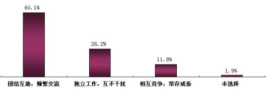 為了更深入了解電子工程師的生存環(huán)境,我們特意設(shè)置了這個問題。對每一位工程師來說,同事關(guān)系處理的如何,直接影響著他們的工作質(zhì)量和生活質(zhì)量,良好的同事關(guān)系,利人利己,利公利私。特別讓我們欣慰的是,60.1%的電子工程師和同事處于團(tuán)結(jié)互助,頻繁交流的工作狀態(tài),在目前經(jīng)濟(jì)危機(jī)的陰霾籠罩下,這樣同事關(guān)系顯的尤為重要。(見圖表七)