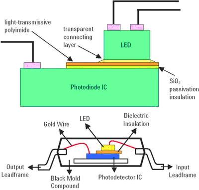 光電二極管芯片采用兩個(gè)透明的層:SiO2鈍化/絕緣和光傳導(dǎo)聚酰亞胺。LED使用透明的連接層穩(wěn)固地連接到光電二極管上。IC使用銀環(huán)氧樹脂,通過模具連接到引線框上。介電材料使用光傳導(dǎo)環(huán)氧樹脂連接到IC上。LED模具使用光傳導(dǎo)環(huán)氧樹脂連接到介電材料上。最后,組件使用焊接線和澆鑄。它使用標(biāo)準(zhǔn)模具連接工藝,完成所有放置,封裝在單次不透明澆鑄化合物中完成澆鑄。
