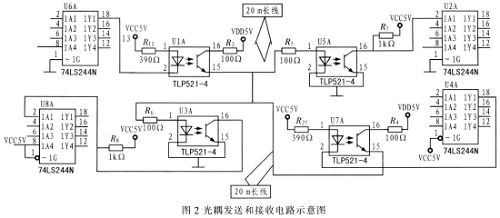 采用光電隔離器TLP521-4對發(fā)送和接收設(shè)備進(jìn)行電氣隔離,對于減小交流阻抗的作用十分明顯,進(jìn)而增大傳輸電流,有效地抑制地線噪聲;同時(shí)由于74LS244N的應(yīng)用。總線驅(qū)動(dòng)能力得到保障。圖2為光耦發(fā)送和接收電路示意圖。圖2中,上半部兩光耦自左向右傳輸信號,下半部兩光耦自右向左傳輸信號,左端74LS244N通過靜態(tài)存儲(chǔ)器IDT7132與處理器進(jìn)行數(shù)據(jù)交換,右端通過8255與處理器進(jìn)行數(shù)據(jù)交換。