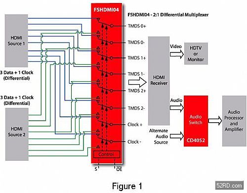 以FSHDMI04 這類HDMI開關(guān)為例,只需簡單地插入到選定的HDMI接收器和兩個HDMI連接器之間即可。若針對一個完整的解決方案,還需要切換較高電壓及較低頻率的控制信號,建議使用一個至少165MHz的簡單5V 方型 SPDT開關(guān),例如FSAL200 或 FSAV330。這些控制信號用于接收器(Sink) 和資料源(Source) 之間的首次交換,而資料源以此來決定接收器能夠處理什麼樣的視頻解析度,只需要FSHMDI04加上第二個用于控制資料的開關(guān),即可在單輸入設(shè)計上完全實(shí)現(xiàn)第二個HDMI輸入埠。