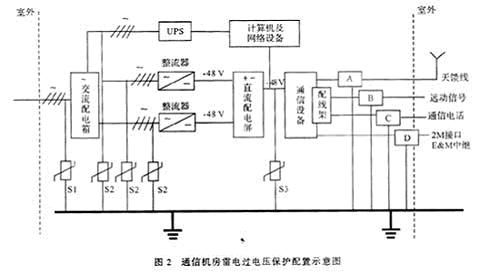 圖為我局通信機房雷電過電壓保護配置示意圖,其中S1為DEHNventil 280/4型電源1、2級復合防雷器,S2為DEHNguard T385型電源2級防雷器,S3為DEHNrail 48FML型電源3級防雷器(直流48 V),A為UGK/N(2.5 G)天饋線防雷器,B為YG20-A音頻隔離變壓器,C為ZH型中和變壓器,D為同軸防雷器。