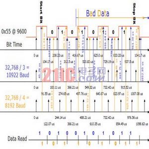 UART數據用10,922波特或8,192波特的UART接收。由于UART在傳輸中間點對數據進行采樣以補償抖動,因此該點已經被選擇為接收UART的采樣點。在沒有行抖動的理想情況下,10,922波特UART對第三數據位的開始兩次讀數都會是錯誤的而8,192波特的UART由于會完全遺漏第三位,很快就將出錯。由于低功耗應用的理想時鐘是低功耗實時時鐘模式,這使得在低功耗環境中處理很困難。解決這一問題的最好辦法就是將µC與調制技術結合使用,用32kHz振蕩器提供非常精確的2,400波特,并完全能支持9,600波特(參見圖3)。