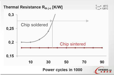 圖2.燒結芯片與焊接芯片的功率循環能力對比