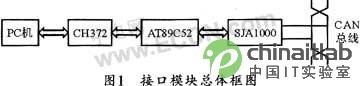 本文所介紹的USB-CAN轉接技術總體框圖如圖1所示,該設計分兩大部分:一是與主機USB接口相連的USB控制部分;二是與CAN總線相連的CAN控制器部分。兩者中間通過單片機聯系起來。USB控制部分用USB接口控制芯片CH372來實現數據的接收和發送;CAN控制器SJA1000用來實現CAN總線間的數據通信。單片機用來進行相應的控制、協調以及系統的通信。