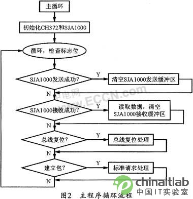 單片機AT89C52在系統中主要起到一個橋梁和協調控制的作用。主機通過CH372把數據發送到單片機,單片機再把數據通過SJA1000發送到CAN總線,從而實現整個系統的通信。此外,單片機還需要對CH372和SJA1000進行初始化,并通過地址/數據以復用的方式訪問CH372和SJA1000。由于在訪問其中一個芯片時,如果另一個芯片還保持有輸出,那么單片機就不能讀到正確的數據,因此,單片機要通過片選控制信號分配有效地址。單片機主要通過主循環來監控系統的通信,其主循環流程圖見圖2所示。[page]