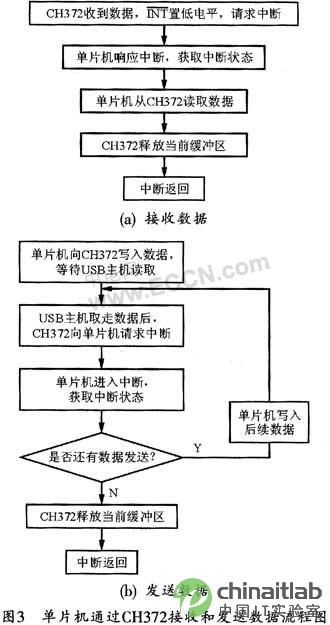 CH372芯片專門用于處理USB通訊。在接收到數據或發送完數據后,CH372將以中斷方式通知單片機進行處理。單片機通過CH372接收和發送數據的流程圖如圖3所示。