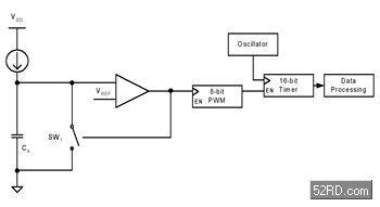 比較器的輸出用來作為脈沖寬度調變(PWM)的時脈,并進而成為使用高速內部時脈計時器的極閘。當PWM產生插斷訊號時,計時器上的值就可以被讀取并且儲存該輸出值。