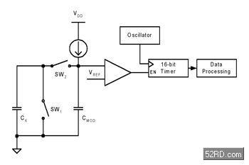 感測電容器CX與電流源都連接至一個類比多工匯流排上,其中電流源決定了感測電容器中充電的速率。而該電容器兩端電位差會隨著充電電荷累積到匯流排而產生線性增長,其關系式為q=CV。