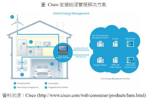 在綠色節(jié)能觀念的日益普及趨勢下,有效管理家中用電的家庭能源管理(Home Energy Management,HEM)成為智慧電網(wǎng)公共建設(shè)外,另一項具備高度發(fā)展?jié)摿Φ氖袌鲱I(lǐng)域。面對民眾對節(jié)能管理的需求,現(xiàn)階段陸續(xù)已有許多國際大廠投入相關(guān)應(yīng)用與服務(wù)的研發(fā);除了Google推出PowerMeter的用電監(jiān)測網(wǎng)路平臺外(需搭配智慧電表或插座等設(shè)備),Cisco與Intel也陸續(xù)搭上平板電腦熱潮,推出協(xié)助民眾管理家庭用電的HEM裝置。相較于Google PowerMeter,Cisco與Intel所推出產(chǎn)品是以物聯(lián)網(wǎng)(Internet of Things,IoT)概念為基礎(chǔ),透過無線網(wǎng)路模式連結(jié)家中各項電器設(shè)備,進(jìn)行用電資訊的傳遞與監(jiān)控,同時進(jìn)行遠(yuǎn)端遙控動作。 Cisco推出包含家庭能源控制器(Home Energy Controller,HEC)與能源管理服務(wù)平臺的家庭能源管理解決方案(Home Energy Management Solution,HEMS),作為進(jìn)入家庭節(jié)能市場的第一步。 HEC如同家庭中的監(jiān)控中心,除了可以在螢?zāi)簧霞磿r顯示家中用電的即時狀態(tài)資訊外,使用者透過觸控面板的HEC還可以對連線的家電產(chǎn)品進(jìn)行操控,決定是否關(guān)閉或調(diào)整特定家電來節(jié)省電力消耗。