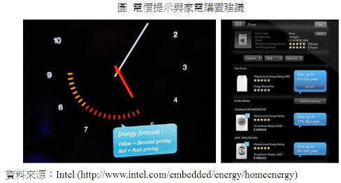 如同前述的家庭能源管理項目,Intel儀表板透過ZigBee無線技術(shù)連結(jié)家中的各項家電,監(jiān)控用電狀況。此外,透過WiFi連結(jié)家中寬頻網(wǎng)路,可與當(dāng)?shù)氐碾娏具M(jìn)行資訊傳遞或更新(或透過Zigbee技術(shù)與智慧電表連結(jié),進(jìn)一步與電力公司連線)。而透過儀表板上顯示的差異電價時段或市面上各項家電的耗能(節(jié)費)資訊,儀表板可以提供使用者用電與家電購置的建議,甚至可協(xié)助計算需使用多久的時間才能回本。