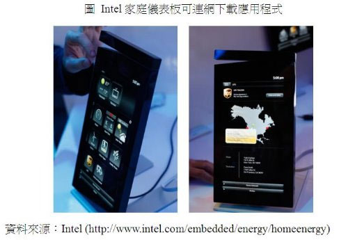 在家庭能源管理的概念下,Intel也推出暫稱為「家庭儀表板(Home Dashboard)」的整合性解決方案,產(chǎn)品設(shè)計為一個具備運算能力且低耗能的平板電腦。 Intel規(guī)劃此產(chǎn)品成為家庭網(wǎng)路的核心(Heart of the Home Network),使用者可與智慧家電、智慧插座、智慧電表與家中各項感測裝置進(jìn)行連結(jié)與監(jiān)控動作,并進(jìn)行家電設(shè)備的安全設(shè)定、溫控設(shè)定、電源