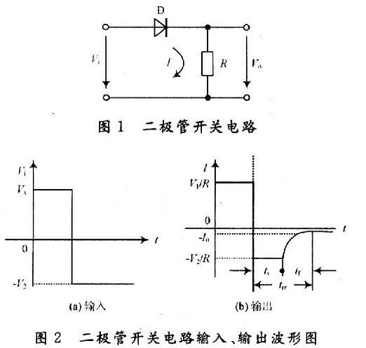 [page]如圖1所示,輸入端施加一脈沖信號Vi,其幅值為+V1和-V2。當加在二極管兩端的電壓為+V1,二極管導通;當加在二極管兩端的電壓為-V2,二極管截止,輸入、輸出波形如圖2所示。二極管兩端的電壓由正向偏置+V1變?yōu)榉聪蚱?V2時,二極管并不瞬時截止,而是維持一段時間ts后,電流才開始減小,再經(jīng)tf后,反向電流才等于靜態(tài)特性上的反向漂移電流I0,其值很小。ts稱為存貯時間,tf稱為下降時間,ts+tf=trr稱為關斷時間。二極管兩端的電壓由反向偏置-V2變?yōu)檎蚱?V1時,二極管也不是瞬時導通,而是經(jīng)過導通延遲時間和上升時間后才穩(wěn)定導通,這段時間稱為開通時間。顯然二極管的導通和截止時刻總是滯后加于其兩端高、低電平的時刻。二極管從截止轉(zhuǎn)為正向?qū)ǖ拈_通時間,與從導通轉(zhuǎn)向截止時的關斷時間相比很小,其對開關速度的影響很小,在分析討論中主要考慮關斷時間的影響。