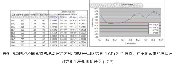 [page]塑料射料LCP在已設定射出溫度、射出壓力、充填時間之條件參數后,再設定仿真之各參數,如表5所示。透過田口方法實驗規劃,可得L9直交表,如表6所 示。依據L9直交表,可清楚得知有9組田口規劃之實驗參數,再分別針對這9組參數,實際作射出成形,并量測實際翹曲度,量測之結果,大部份數據皆不符合塑 料翹曲度(Flatness) 0.05mm規格內,如表7所示。仿真之最佳化參數為第三組,其參數為射出溫度315℃、射出壓力 140 MPa 、充填時間0.9 s,如圖3所示。