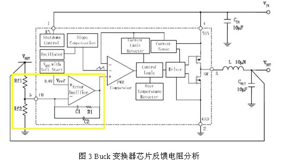 Buck變換器由于具有效率高的優(yōu)點而被廣泛應用于手機、GPS、MP3等移動多媒體設備上,目前很多電源管理芯片制造廠商都推出了不同電流能力的Buck變換器,這類變 換器雖然在電流能力和保護功能方面存在一些差異,但是他們電路的主框架結構是基本一致的,主要可以分為兩個部分:一是實現電能轉換的主功率部分,另一部分 是實現負反饋控制的控制電路。下圖是BCD半導體公司的Buck變換器AP3406的典型應用圖,黃色框里是對反饋電阻的作用做簡要分析。