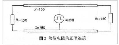 ②阻抗不連續。顧名思義,與光從一種媒質進入另一種媒質時所引起的反射是相似的。信號在傳輸線末端突然遇到電纜阻抗很小甚至沒有,信號在這個地方就會引起反射。消除這種反射最常用的方法,是在電纜的末端跨接一個與電纜的特性阻抗同樣大小的終端電阻,使電纜的阻抗連續。由于信號在電纜上的傳輸是雙向的,因此,在通訊電纜的另一端同樣要跨接一個相同大小的終端電阻,如圖2所示。