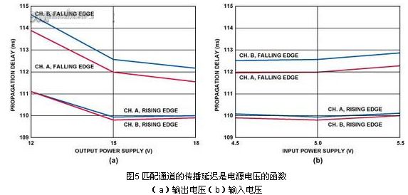 由于兩個通道之間的定時關系是十分重要的,而且PWM信號在反相階段驅動IGBT,因此與LED和光電二極管相比,iCoupler技術的速度、穩定性和可靠性是非常出色的。如圖5的曲線所示,在輸出電壓范圍為12 V~18 V,輸入電源電壓范圍為4.5 V~5.5 V的情況下,兩個通道的上升沿的傳播延遲是匹配的,約為100 ps,而且下降沿的傳播延遲優于1 ns。
