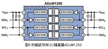 iCoupler技術實現的集成隔離解決方案以較低的成本降低了電路板尺寸要求和設計復雜度。圖6所示的ADuM1250和ADuM1251實現了真正的雙向隔離,并且集成了用于消除毛刺信號和鎖定的緩沖器。這種高度集成的解決方案僅需兩個旁路電容和兩對上拉電阻(I2C標準的規定),并且能夠以較低的成本提供I2C接口。有關這些器件的使用細節,請參考應用筆記AN-913“PC接口隔離”。