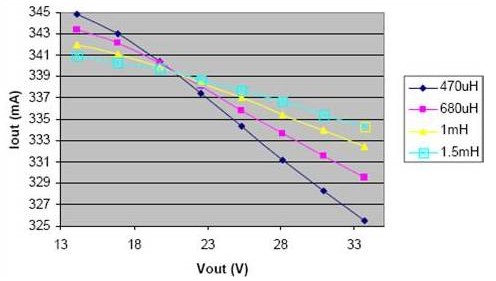 下圖給出了頻率根據不同的輸出電壓和不同的電感值的變化曲線。