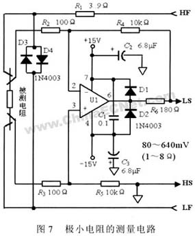 對于極小阻值范圍的電阻測量可以采用圖7所示電路完成,它可以測量10~ 80mΩ的電阻。通過差分運算放大電路,把被測電阻產生的微弱電壓信號放大100倍,因此實際電阻值是測量值要除以100。圖中運放UI采用低噪聲、高速、精密運放,如OP-37EJ,AD645或MAX400。和高電位施加線(HF)串聯(lián)的電阻R1是用來匹配電流施加模塊的最佳輸出負載,R2到R5采用高精度高穩(wěn)定性的電阻來保證差放電路增益的穩(wěn)定,這決定了測量的精度和重復性。為了保證精度,對運放的電源電壓要求很高,電路的安裝位置要盡可能靠近被測電阻,所有探頭要盡可能短,C2,C3要盡可能靠近運放。