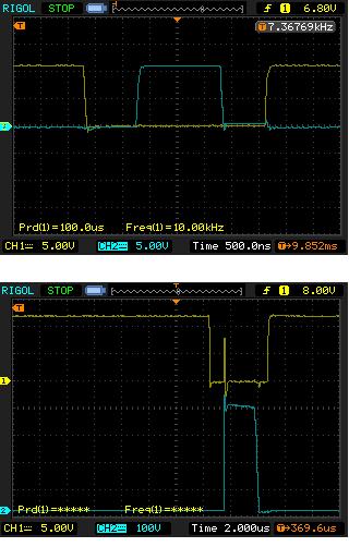 上面的圖是在不加DC400V情況下測量2管G極波形,下圖是在DC400V情況下,2管的柵極波形。