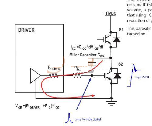 那么在來看看為何400V加上去,就會在下管上的G級上產(chǎn)生尖峰。借花獻(xiàn)佛,抓個圖片來說明:
