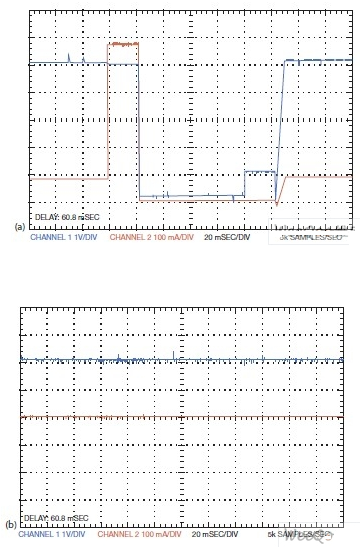 圖2,圖1中的這些電流/電壓波形表示輸出端A的一個(gè)過(guò)載 (a) 并不影響輸出端B (b)。