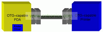如上所述,線纜方向決定著連接處兩個 OTG 設備扮演的設備角色。主機通信協議 (HNP) 定義了一種在主機和設備角色之間動態切換的方法。為什么要切換角色呢?如果我們查看圖 2,并考慮到每個 OTG 設備都必須包括一個 TPL,我們便能理解這種要求。左邊的設備在其 TPL 上有一臺打印機,但其并“不”在打印機的 TPL 上。如果用戶“倒過來”插入線纜(如圖 2 所示),則如果不倒置角色兩個設備之間的通信便不可能進行。把線纜從兩個設備取下,然后將線纜端點倒過來再重新連接,便可以實現通信。OTG 規范內置到了協議中,以自動地應對這種情況。HNP 允許靜默和自動角色倒置,從而實現通信。相比強制規定用戶斷開線纜然后倒置,這樣做提高了最終用戶體驗。正因這樣,需要注意的主機通常為 A 設備但卻并非始終如此,這一點很重要。