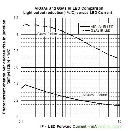 在 1mA 下工作時(shí),GaAs IR LED 光輸出減少 1%/°C。 這意味著結(jié)溫升高 50 °C 時(shí),LED 的輸出會降低 50%。 使用 AlGaAs IR LED,光輸出僅降低 0.225%/°C,因此,結(jié)溫升高 50°C 而光輸出僅降低 11%。