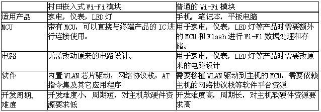 用于通訊產品的Wi-Fi模塊,因為終端產品,如手機,筆記本具有強大的CPU和Flash進行數據處理和存儲,因此在使用Wi-Fi時不需要額外的MCU。但是用于家電,儀表,LED燈等產品的Wi-Fi模塊,因為終端產品的MCU和Flash都無法支持Wi-Fi的功能,因此需要額外的MCU和Flash進行數據處理和存儲。為在這些產品上的應用提供方便,簡單的解決方案,村田開發了帶有MCU的Wi-Fi模塊-嵌入式Wi-Fi模塊。