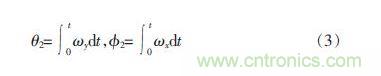 若使用陀螺儀來測量平衡車姿態角度,設陀螺儀測量載體相對慣性坐標系的x、y、z 三軸旋轉角速度分別為ωx、ωy、 ωz。并定義0 時刻平衡車直立靜止??傻玫礁┭鼋?theta;2和橫滾角φ2估計值與ωx、ωy之間的關系如式3 所示:
