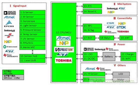 ①采用集成了符合低功耗的Bluetooth 4.0,以及傳感器和處理器,專門應(yīng)用于穿戴式裝置的Toshiba TZ1001;