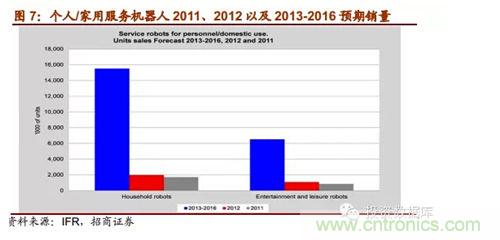 IFR報告預期,從2013年到2016年,全球工業(yè)機器人市場將以年均6%的速度增長,中國是這一增長趨勢的領跑者,年均增長率達15%。根據(jù)marketsandmarkets的報告,2011年全球服務機器人市場規(guī)模為183.9億美元,到2012年增長到207.3億美元,計2012-2017年全球服務機器人市場規(guī)模復合增速將達到17.4%,到2017年達到461.8億美元。對于專業(yè)服務機器,IFR預測2013-2016年估計有94800臺專業(yè)服務機器人會得到安裝使用,銷售額達171億美元。其中軍用機器人銷量約達28000臺;場地機器人中的擠奶機器人銷量估計為24500臺。兩者占總專業(yè)服務機器人銷量55%。