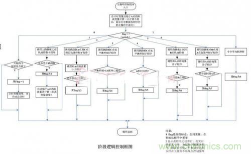 系統框圖如圖3所示,主控循環程序每隔一個采樣周期從FPGA接口中讀取各個傳感器的數值,并經過處理后獲得小車的運行狀態,根據小車的當前狀態采取相應的控制算法計算出電機所需的控制電壓值,進而,該控制電壓值經過PMW處理后輸出到小車驅動電機,使小車按照希望的規律運動。為了使程序流程清晰簡潔,框圖中以一個標志信號來記錄小車所運行的階段,控制器則根據小車所處的運行階段進行相應的控制。