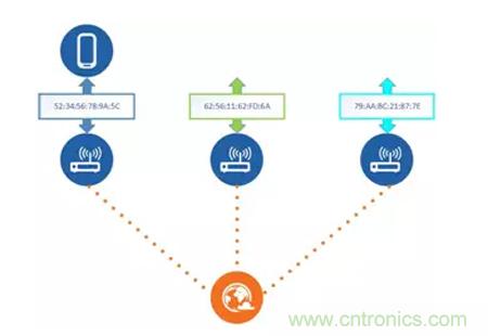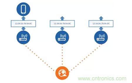 我們可以試想一下,當(dāng)我們每天搭乘公共交通穿行了整個城市,當(dāng)我們在商場購物或是和朋友在餐廳聚餐的時候,你的智能手機可以幫助你付費、點單和導(dǎo)航。如果你的智能手機接入到網(wǎng)絡(luò)熱點當(dāng)中進行互聯(lián)網(wǎng)訪問的時候,它就可能會在這一系列的過程當(dāng)中來廣播其MAC地址。我們前面提到了MAC地址在網(wǎng)絡(luò)通信當(dāng)中的唯一性,你又是智能手機的使用者,那么這部智能手機的MAC地址從某一角度來講,就代表了你在無線通信過程當(dāng)中的身份認證。因此就存在這樣一種可能,一些懷有惡意的人通過一些其他的無線通信設(shè)備,可以獲取你的智能手機進行數(shù)據(jù)交互時的MAC地址并且記錄了MAC地址出現(xiàn)的日期、時間和相關(guān)的位置,那么你的行蹤就可以被監(jiān)控,如下圖所示。