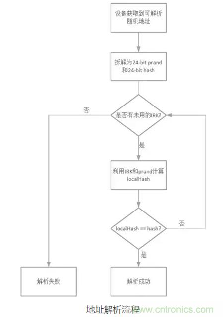 因此,對于可解析隨機地址的解析,我們可以認為它是一個窮舉的過程。任何設(shè)備在收到一個可解析隨機地址的時候,都會利用其本地所存儲的所有IRK對這個可解析隨機地址進行哈希比對,如果相符,解析過程終止,這個地址的真實身份可解析;如果所有的IRK都無法對這個地址進行解析,那么解析失敗。
