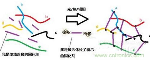 把相對容易流動的液體材料變成固體,這種思路其實并不新鮮,硫化橡膠就是這種材料加工方式的典型例子。那么,固化的過程是如何發生的呢?下面,就讓我們來看圖說話:
