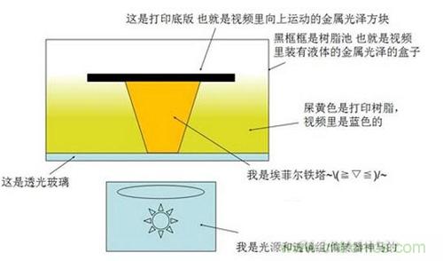 簡單來說,立體光固化的過程就是光照射光敏樹脂表面,使其固化成薄薄的一層固體,已經固化完成的部分被一塊基板黏附著,逐漸與光照射面拉開一定距離(通常是每次移動十幾個微米),然后在上一層固化樹脂的基礎上再進行下一層的照射和固化。經過層層固化疊加之后,最終就形成一個完整的立體結構。下面這張圖表示的就是SLA設備的基本結構,固化反應發生在打印樹脂與透光玻璃板的交界面上,由于光照射面在液面的下方,打印的過程看上去就像從液體里“拉”出了打印制件一樣。
