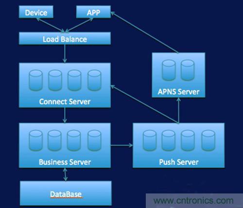 看一下最簡(jiǎn)單的IM架構(gòu),這里面要保持長(zhǎng)連接,接下來(lái)做一些業(yè)務(wù)處理,下面是存儲(chǔ),如果App要去控制Device的時(shí)候,發(fā)到業(yè)務(wù)層處理完了之后,這里面有一個(gè)推送的,可以找到Device到底連了哪一臺(tái)機(jī),然后再把數(shù)據(jù)推送過(guò)來(lái)。如果Device自己的狀態(tài)發(fā)生變化,它的數(shù)據(jù)要推送給APP,基本上是這樣的工作流。如果App是黑莓等設(shè)備的,我們可能要專門推送到APNS里面來(lái)。