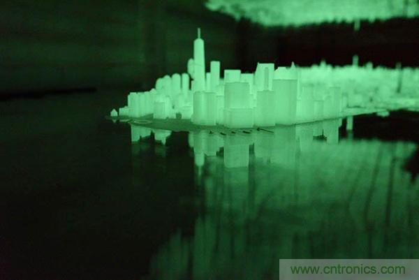這些城市街區(qū)是用3ds Max和Rhino軟件設(shè)計(jì)之后,再用能夠在黑暗中發(fā)光的半透明線材3D打印的。這其中的每個(gè)模型都經(jīng)過了精心設(shè)計(jì)使之盡可能地與真實(shí)保持一致。除此之外,Huang還會(huì)偶爾在個(gè)別細(xì)部的地方秀一下自己的幽默感,比如他就3D打印了一個(gè)金剛并將其放到了自由塔上。