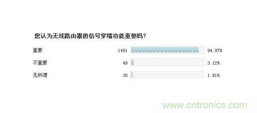隨著Wi-Fi終端的大量普及,人們對于無線路由器的需求也越來越高,不過在此前展開的有獎調查活動中,從收集到的大約1500份反饋里,有高達94.97%的參與者認為無線路由器的信號穿墻功能相當重要。可見人們在選擇無線路由器產品時,信號能否穿墻,覆蓋范圍怎么樣,已經成為他們采購時的首要考察因素。