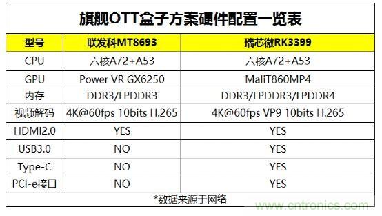 超高規CPU與GPU,可秒殺目前市場主流的海思Hi3798、海思3798C V200、全志H8、晶晨S905、聯發科MT8693等產品。而性能與RK3399差距不算太大的晶晨S912,目前量產時間仍待定,因此在整體盒子芯片環境中,RK3399目前尚無對手。